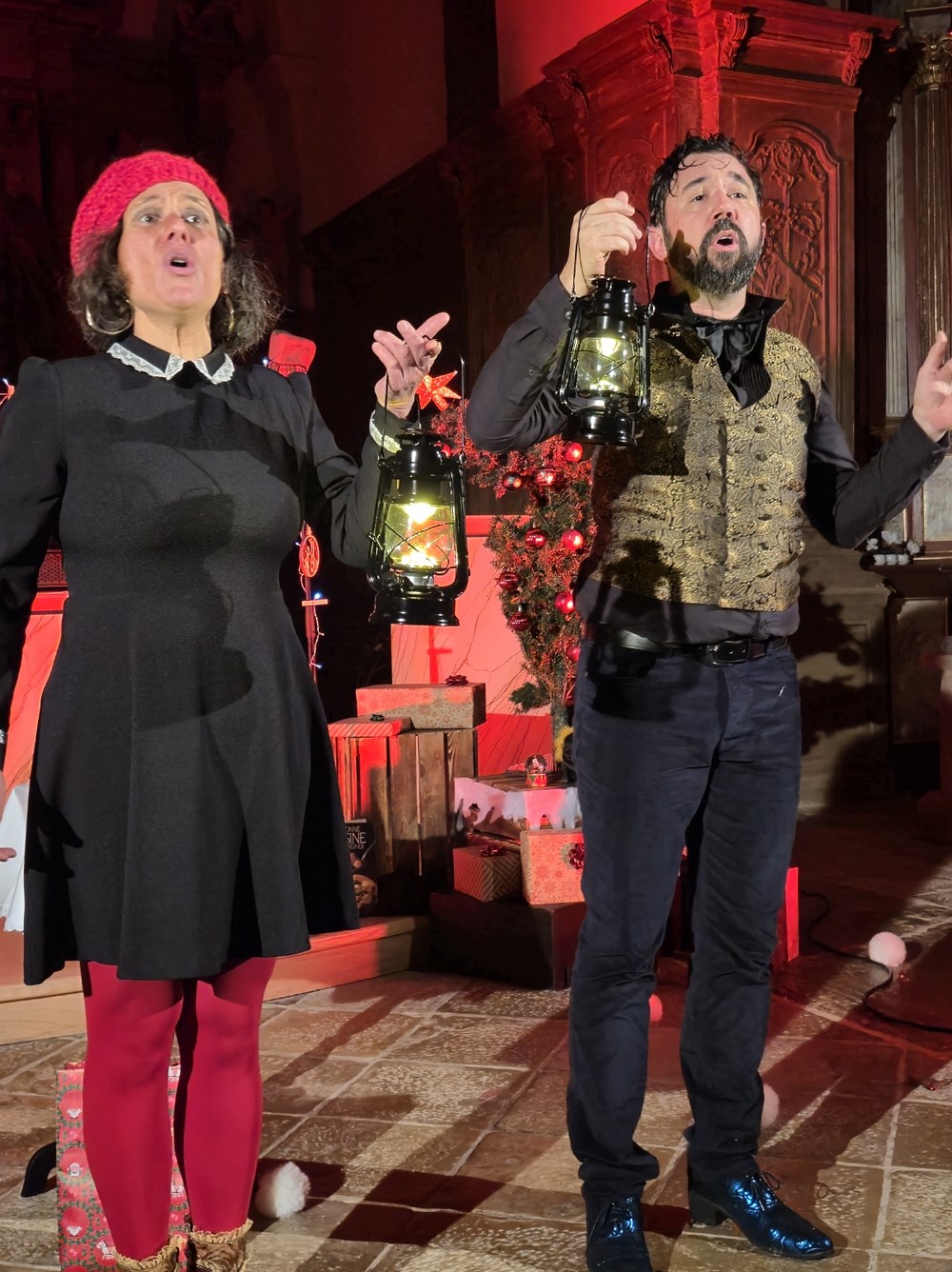 En invitant cette année la compagnie alsacienne « Le Vent en poupe », l’Amicale a voulu faire battre le cœur des nostalgiques fêtes de Noël : l’avant, les veillées, les bons repas (3 jours en Alsace !) la crèche, le sapin…Au programme des deux artistes Virginie et Loïc qui en préambule avaient aménagé un décor « de circonstance » devant le magnifique retable de l’église : Un fil conducteur « enneigé » avec contes, poésies, chants traditionnels « arrangés » à deux voix tout en invitant le public à chanter et danser avec eux. Public nombreux d’ailleurs et au diapason de leur aventure pour dire « Bienvenue à Noël ».